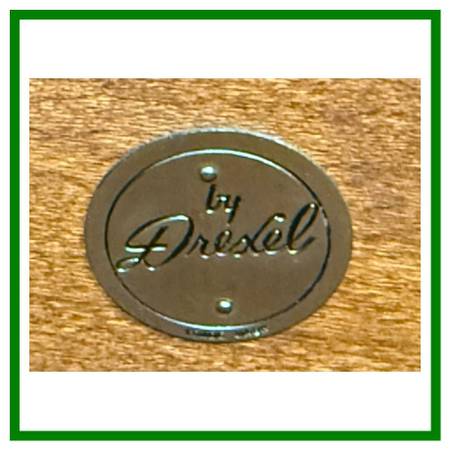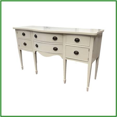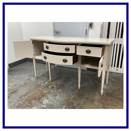 Design Plus Gallery presents a Credenza from Drexel. A truly becoming piece for your home to functionality that will improve any room it is placed in. The piece has a nice cream tone, like ecru or eggshell with antique brass hardware. There are two center drawers with an open cubby on the left side and a single drawer with cubby door on the other side. It rests on six tapered legs with the four front ones have pointed, dagger ends. The brand plate is within a drawer and no longer in production. It is in good condition, visible and minimal wear for its usage. Made in the USA.