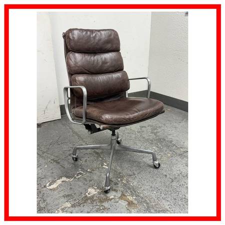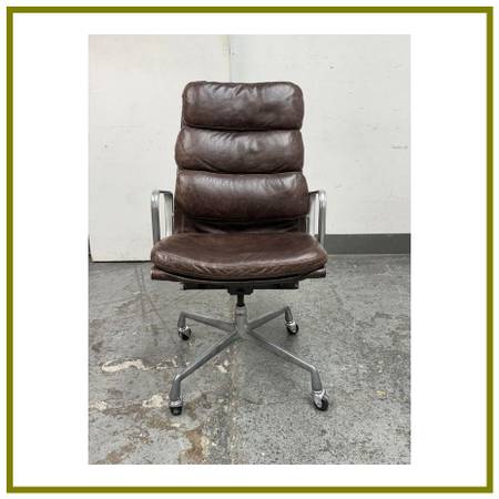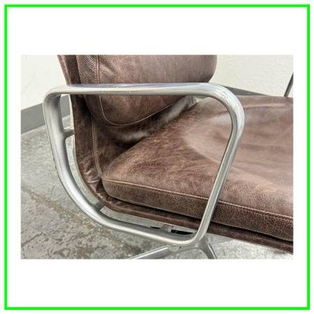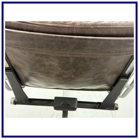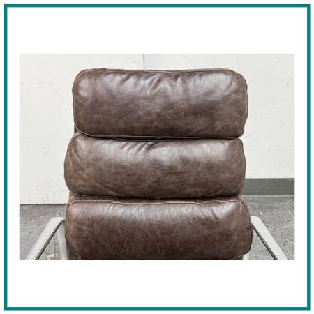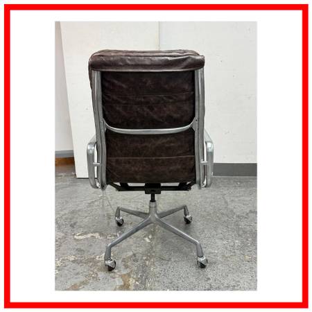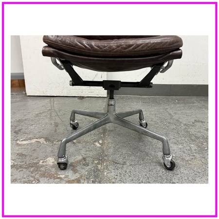 Design Plus Gallery presents a Brown Leather Executive Eames Chair from the Late 20th Century by Herman Miller. The chair is model EA37 that was originally designed by Charles Ray Eames for Herman Miller in 1969. This example dates to likely the late 20th century. The design features a cast aluminum frame with an adjustable five star base on casters. The seat has plush cushions that are two inches thick and was recently reupholstered in a supple brown leather. Overall the vintage chair is in good condition for its usage.