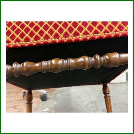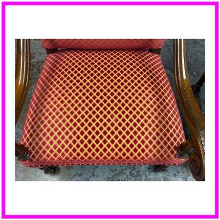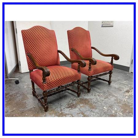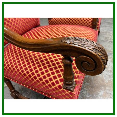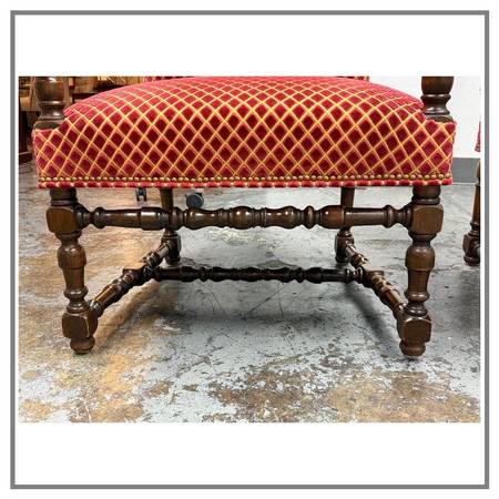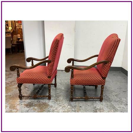 Design Plus Gallery presents a Pair of Vintage Throne Chairs in the Louis XIII Style. The chairs are of the Louis XIII style with massive and solidly built and carved with ornate scrollwork, cartouches, and acanthus leaves. They have high backs and wide deep seats with a red velvet and gold diamond print upholstery that looks rich with the dark wood frame. They are in good condition for their use with minor visible wear.