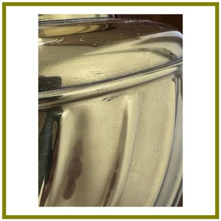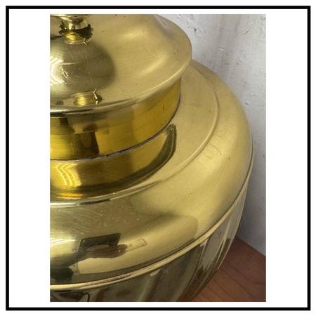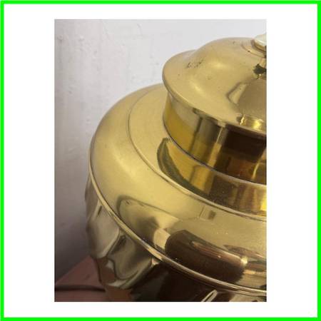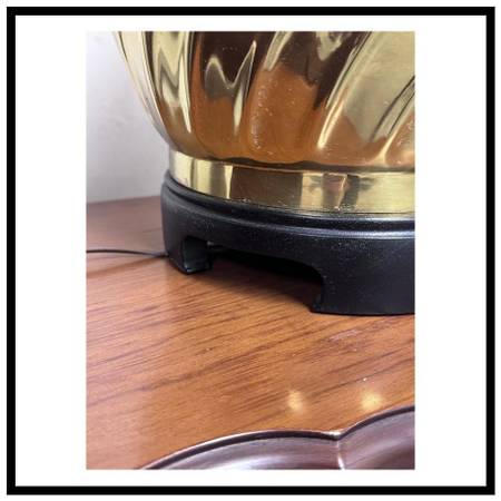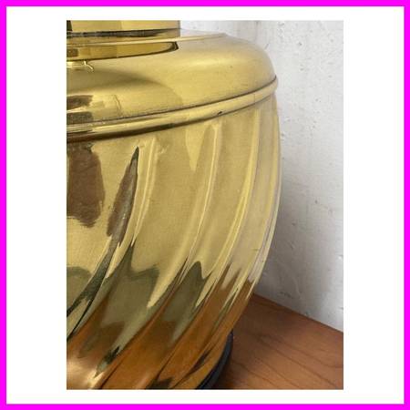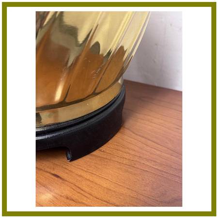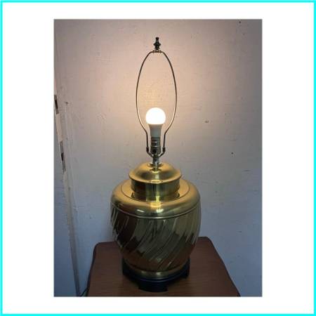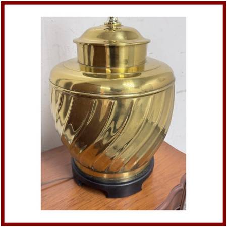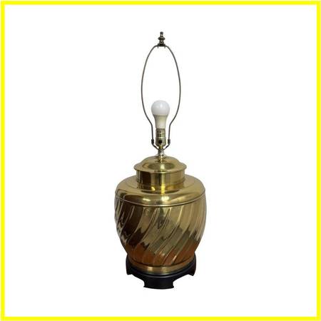 Design Plus Gallery presents a Polish Brass Table Lamp. This vintage brass ginger jarstyle table lamp exudes timeless sophistication with its highpolished finish and classic rounded urn silhouette. The body is adorned with a distinctive swirl, catching the light and adding subtle texture and visual intrigue. Anchored by a sturdy base crafted from wood with an elegant black finish, the lamp beautifully complements both Hollywood Regency and Chinoiserieinspired interiors, offering a glamorous yet versatile accent. Please note, the lamp does not include a shade, allowing you to personalize it to suit your dcor. Perfect for adding an artful statement to side tables, consoles, or bedside stands. In good condition, visible and minimal wear from usage.