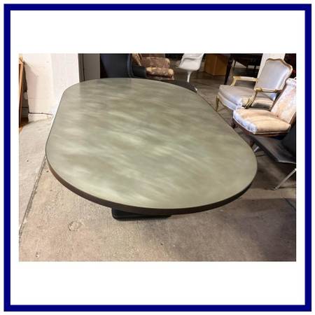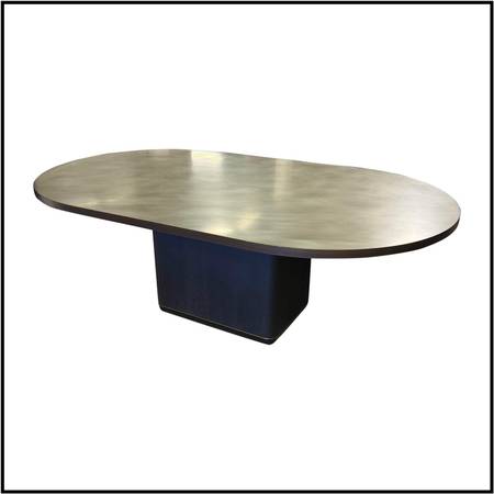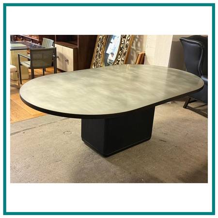 Design Plus Gallery presents a Custom Jasper Pedestal Dining Table from Wud Furniture. Commanding yet refined, the table pairs sculptural presence with everyday durability. A softly rounded, racetrack top with a light patina and subtly burnished finish brings a warm, timeworn glow, while the bold curved pedestal grounds the piece with architectural poise and generous legroom. The base combines charred black oak and blackened steel for depth and texture, a resin surface and edged with a whisper of bronze trim that catches the light and lifts the silhouette. Built to withstand daily life yet designed to make a statement, Jasper balances modern materiality with timeless craftequally at home hosting family dinners or anchoring a dramatic dining room. In good condition, minimal wear from usage.