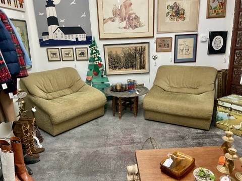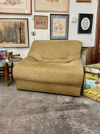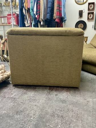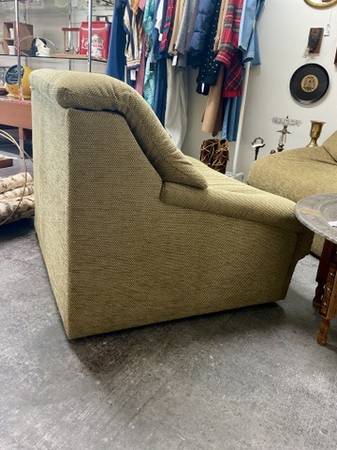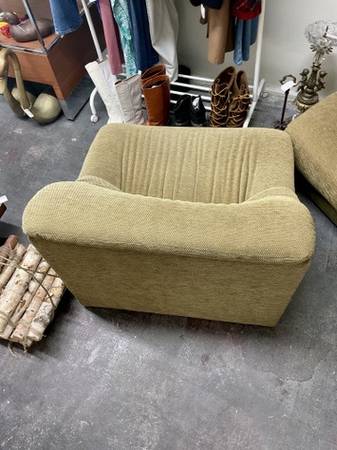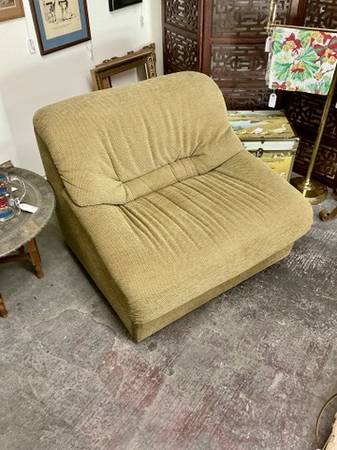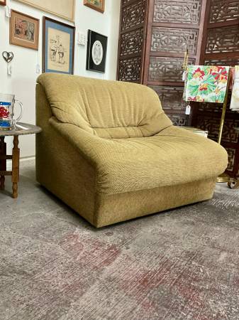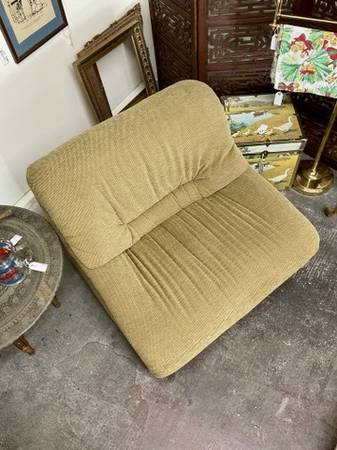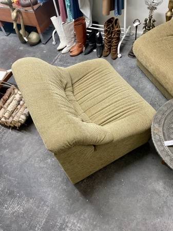 1970s Modular Lounge Chair. Milo Baughman-Style Slipper. Olive Tweed Upholstery. Two chairs, sold separately, price listed is for one chair. Dimensions: 36"W x 35"D x 29"H