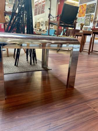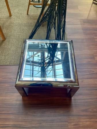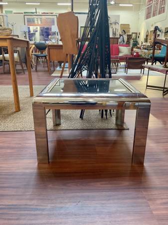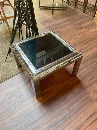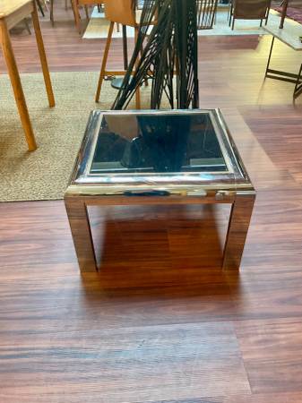 1980's Chrome side table with smoked glass top. Two tables available, sold separately . Price listed is for one table. Some light vintage wear on the top and sides. Dimensions: 24”W x 24”D x 17”H