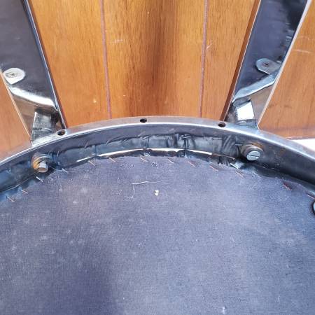 Such an interesting piece with its original design attributed to Pierre Cardin from early into his foray in home decor. This rendition from the family owned outfit out of High Point, NC. Donning the "streamline" aesthetic of the 20s movement with a modern twist, good fit with an Art Deco or even Bauhaus styling. Listing in fair condition as the seat cover needs an updating with two punctures (leather upgrade due anyway IMO). Chrome base actually in great condition for it's age with only one really glaring spot on the top of the "back rest", though needs glides and the hardware for the brace to the seat is mismatched/loose.
