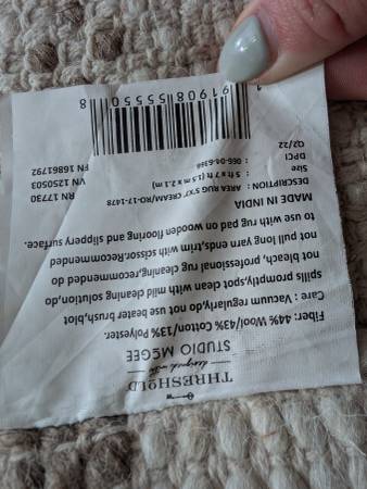 Handwoven Wool area rug in excellent conditions. Only used for staging,no shoes,pets or smoking indoors. It folds so it will fit in any car and not heavy to carry.