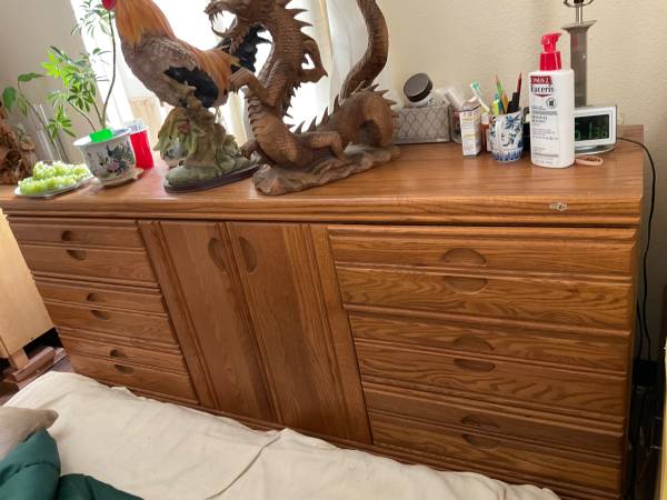 Sideboard Size is 70” W x 18”D x 35” H. Only front side is Solid Oak Wood. 5 Drawer Chest size is L36” x W18” x H50” Price is $ 45. Please pick up from Baker st. & Fell st. In SF ca.