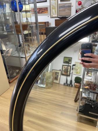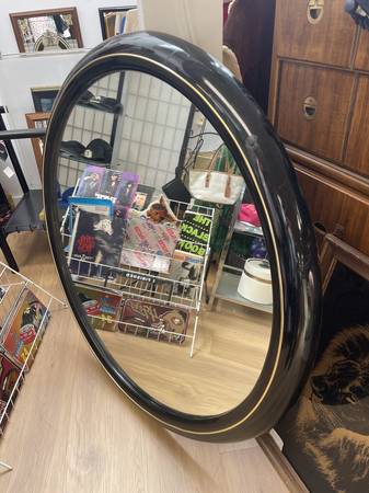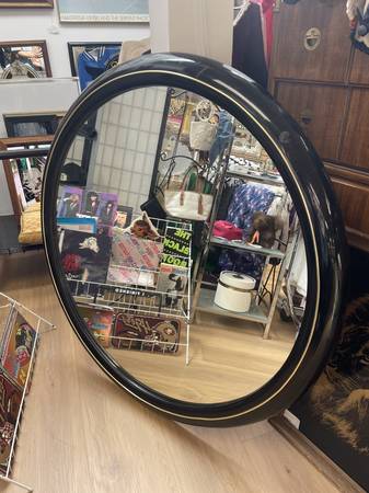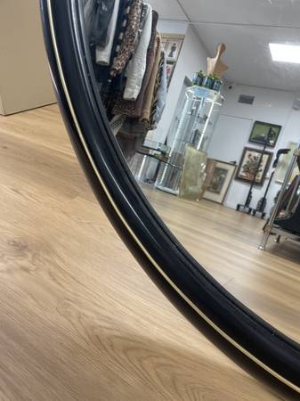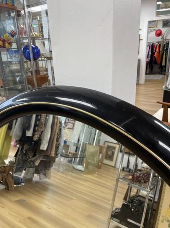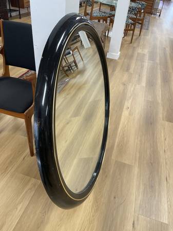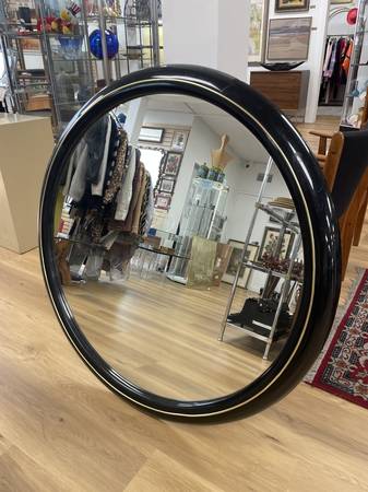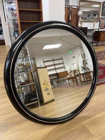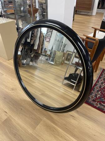 80s, 90s black lacquer mirror Measurements: 42.5”W x 42.5”H Some light vintage wear.