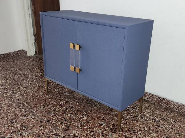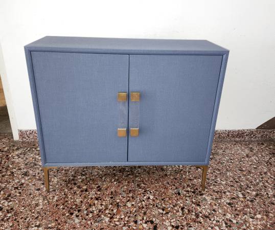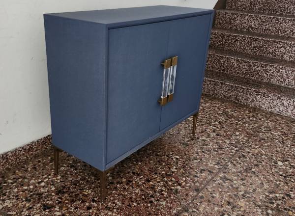 Description: A two-door cabinet inlaid in linen and finished in indigo batik sits atop four aluminum bracket feet. Acrylic and metal hardware finished in brass decorate each door. 1 Shelf with 2 large storage compartments. Absolutely stunning and a gorgeous accent to any place in your home: entry / hallway, living room, dining room, bedroom, office, library, master, guest room. Beautiful sophisticated pop of color that is easy to match with different colors and decor. Sleek and elegant piece.