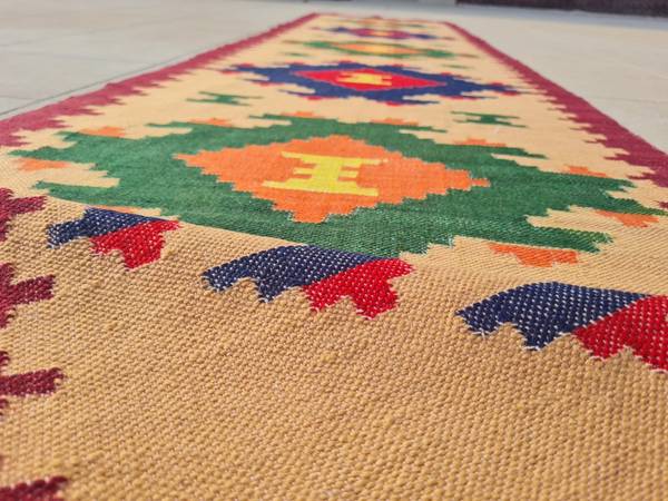 2 feet wide by 9 feet 9 inches long. Pile is flat weave. Material is wool. Runner in very good condition.