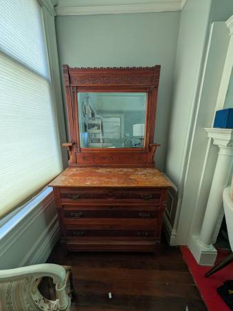 Antique Chest of Drawers with attachable/detachable mirror. Three Drawers, damaged top that will need to be refinished. $300 OBO. If listing is posted, it's available.