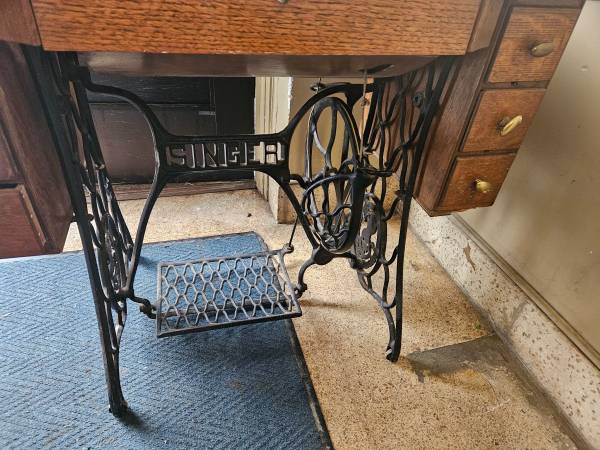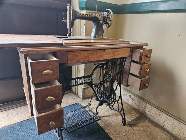 A unique feature of this piece is its original sewing table, which includes six spacious drawers—three on each side—providing ample storage for sewing tools and accessories. Whether you’re drawn to its historical charm or its practical utility, this Singer sewing machine is a true testament to timeless design.