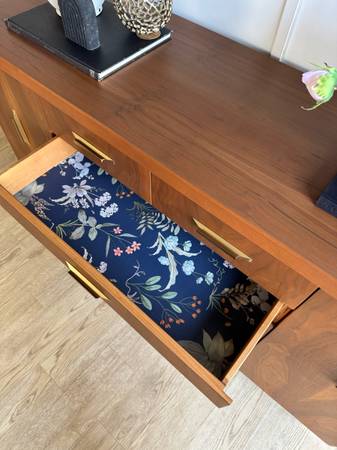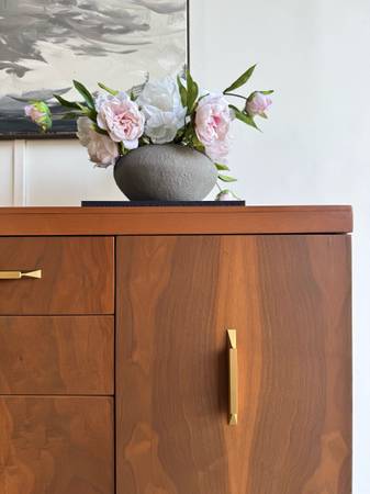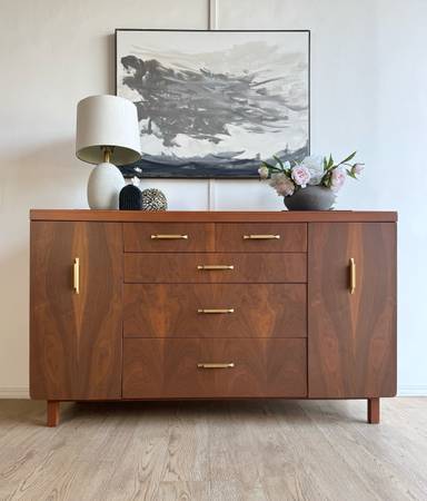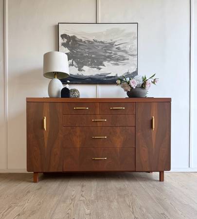 Professionally refinished walnut buffet, sanded down to raw wood, stained and sealed to showcase a gorgeous wood grain, raw wood inside the buffet/drawers/cabinets nourished with beeswax, new solid brass hardware, dovetailed drawers lined with waterproof liners, 5 very spacious drawers glide really smoothly, 2 cabinets offer ample storage space with adjustable shelves.