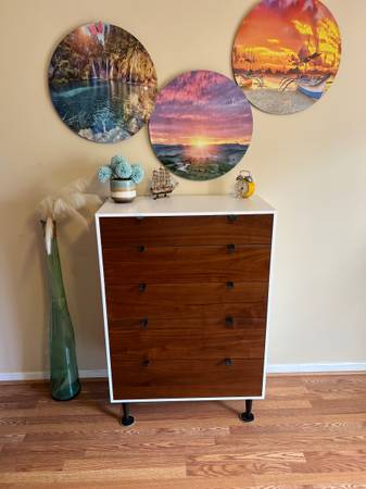 Modern walnut drawers are cased in brilliant matte white lacquer, making it the center of attention. Inside, there’s enough room for everything — including your collection of vintage cashmere sweaters. Drawers are adorned with a stylish leather pull. Features Bronze-colored steel legs Soft close drawers