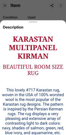 This is the ultimate and iconic Karastan rug, with over 50 colors. No stains, no pets, no smoking, no odors and no rips. Meticulously cared for. It's rare to find this rug in such fine shape. Will last forever if cared for properly.