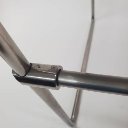 Would think this is a more modern repro of the original, but possibly a vintage homage. Actually flipped the leather as the original pale blue was worse for the wear. Some pesky fly aways from the nylon backing between the layers of leather and base could use touching up. Interesting take with tabs on each corner and cross bars. Most of the hardware was stripped as sourced, but was able to find a handful of the hex with enough grip to dismantle. Base is weighty, but non-ferrous. Cool, form-forward tubular piece for an occasional stool or ottoman if your lounge fits the vibe.