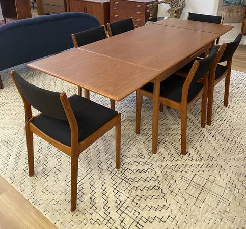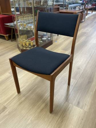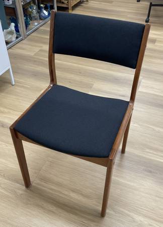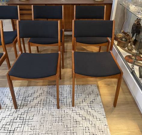 Set of 6 Reupholstered Vintage Mid Century DScan Teak Dining Chairs. Newly Black Fabric. Measurements: 18.5”W x 18.5”D x 32”H Seat: 17.5”H