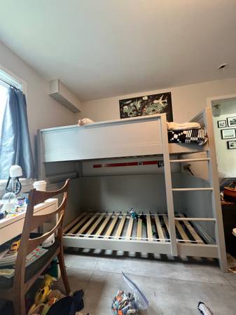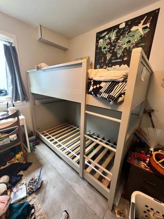 This is an awesome bunk bed! It served us well. It is super sturdy and the footprint isn’t too big because of the way the ladder is attached. It is in great condition, just a couple small dings...