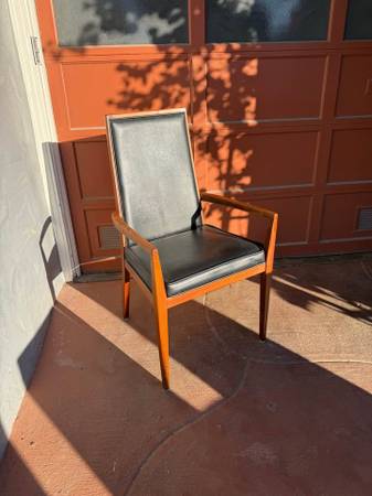Gorgeous set of 6 dining chairs with solid walnut frames and black Naugahyde upholstery by Dillingham. This set includes 2 arm chairs and 4 side chairs. Gorgeous walnut wood grain and easily...