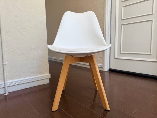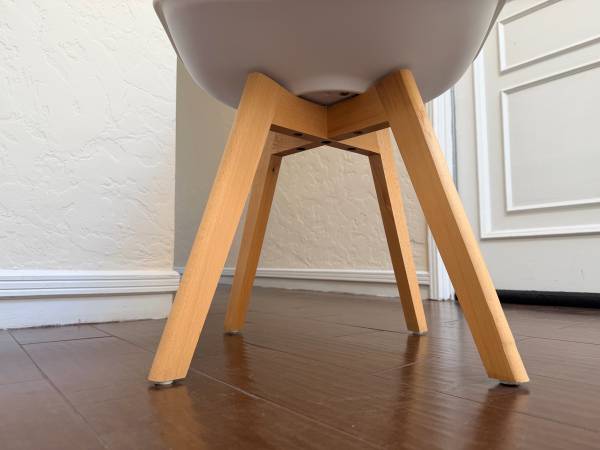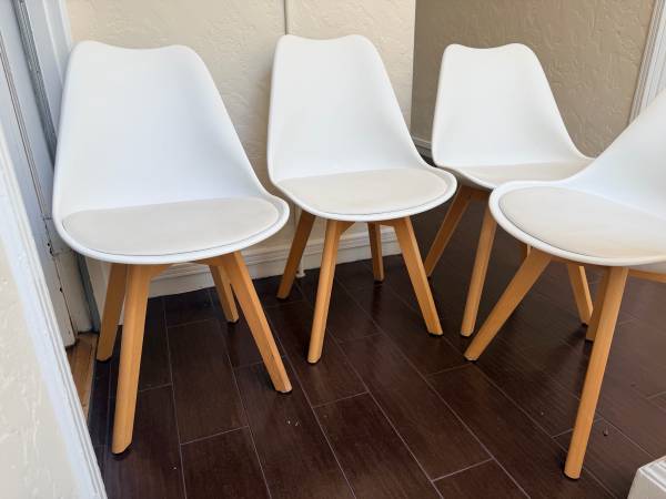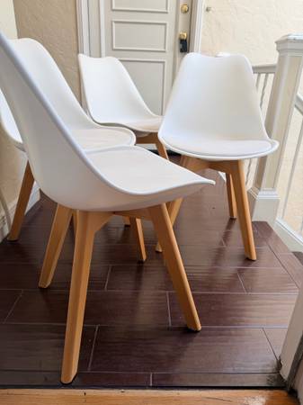 4 white plastic chairs with wooden legs. Pickup in Hayes Valley.