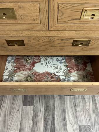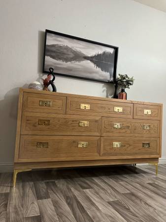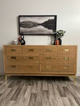 Gorgeous Dresser Campaign style By Henredon Furniture Refinished oak wood dresser , it has been sanded down, stained and sealed. Original hardware . Added new legs , for a modern look. It has seven...