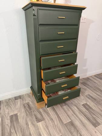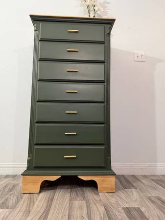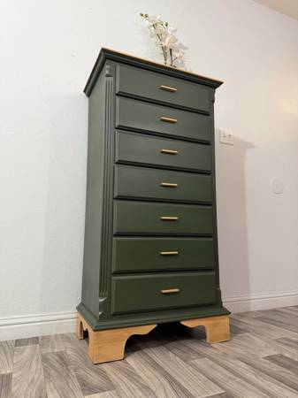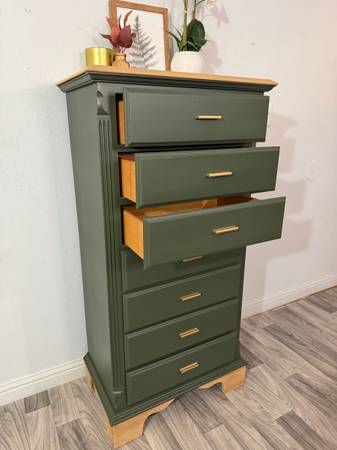 Beautiful Dresser! Refinished wood dresser painted Laurel Woods (green) the top and base has been sanded down stained and sealed . It has seven drawers all lined with waterproof liners. New...