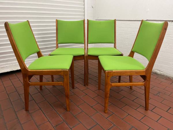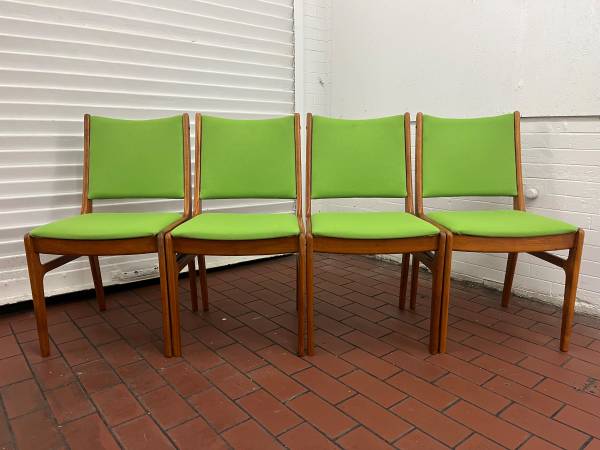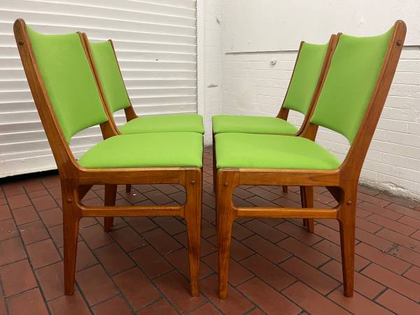 Wonderful set of four teak dining chairs boasting classic Scandinavian design and craftsmanship. This set is in superb condition--each chair was completely cleaned, oiled, and reupholstered. The frames are solid, strong, and sturdy. The old growth teak wood has a beautiful color and wood grain. The cushions have been updated with a modern green wool fabric. Timeless... this set works well with any Danish Modern, Mid Century Modern, or contemporary decor.