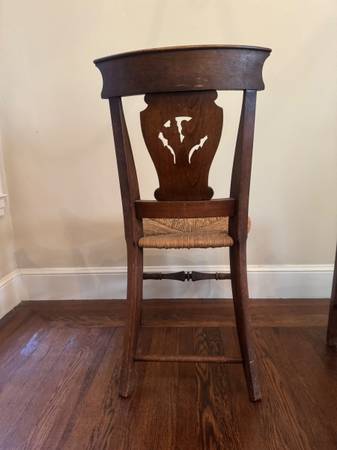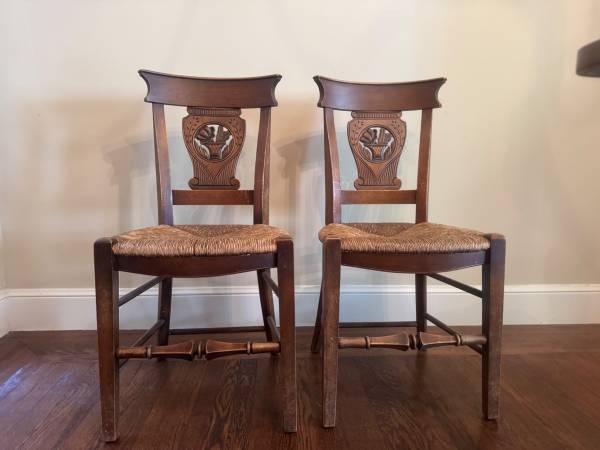 The two vintage chairs were purchased in France by my great aunt in the 1950s. I do not know the age. They are in original condition and show normal wear. The woven seats are still in fine condition.