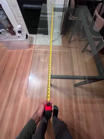 Metal frame with thick glass table top. Was once used as a desk and then later as a dining room table that could comfortably sit 6. Base was spray painted dark brown and could use a new coat of the...