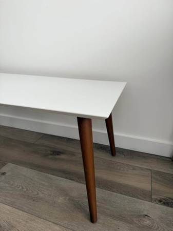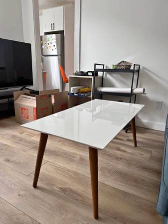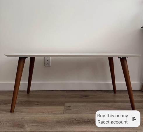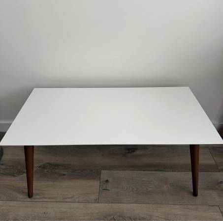 Modern white lacquered coffee table with solid wooden legs. The table is thin but stable, and the top is in good condition, with only some minor chips. Table dimensions: 40. 25"W x 21"D x 17. 5"H