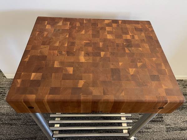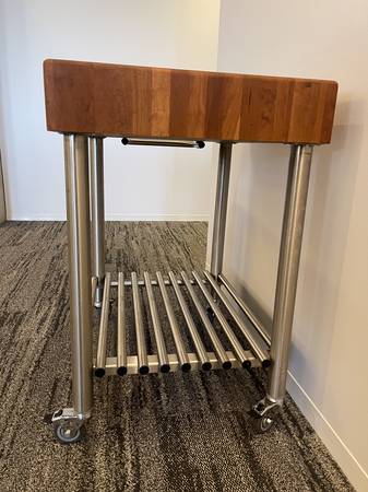 This cart has been gently used and is in excellent condition with no major scratches or damage. Whether you're looking for a mobile prep area, extra storage, or simply a stylish piece of kitchen furniture, this cart will not disappoint.