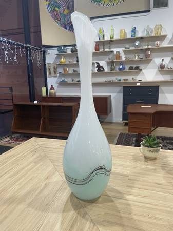 Large Hand blown White/Teal Art Glass Vase Measurements: 6”W x 21”H