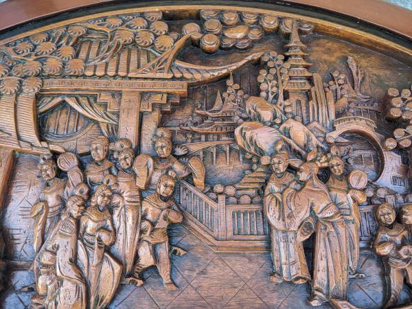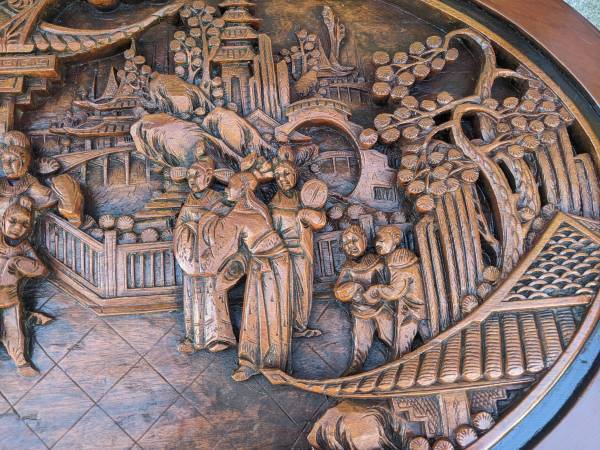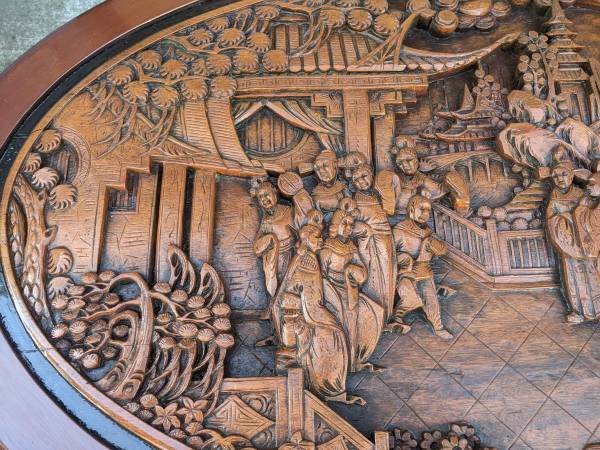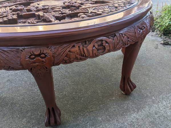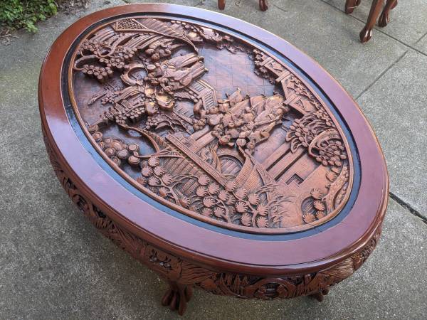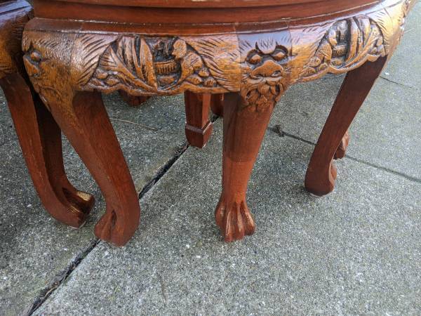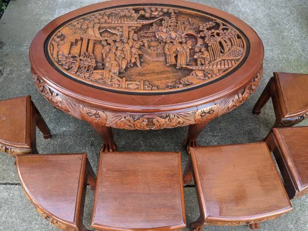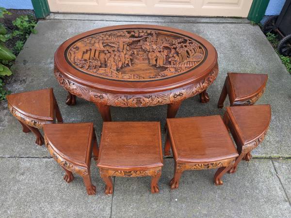 Hi. I'm selling my nice vintage 1960s 7-piece Hand Carved Tea Table In Teak wood. In excellent to like new condition. This set was recently refinished with a new coat of paint. Can also be used as coffee table. This gorgeous set was imported by my grandfather when he visited Shanghai in the 60s. This stunning set looks amazing and beautiful with all around carving around the edges of the table, its legs and the table top. Look at the details of this set and be ready to be mesmerized! Even the 6 stools are hand-carved and made. We have gotten a lot of compliments on this tea set when we have friends over for drinks. This statement piece is truly one of a kind. Tea table dimensions: 42 1/2" x 29" x 19 1/2"H. Stools height: 14". Selling now for $1800. Cash only