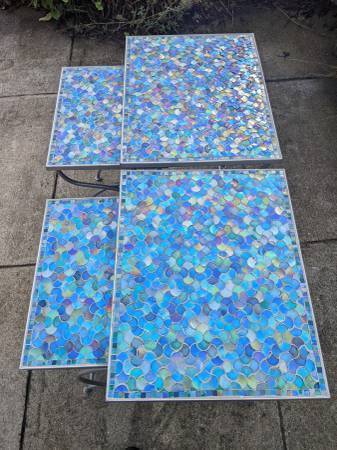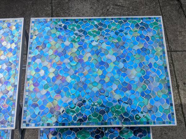 Hi. On sale here is a pair of beautiful and colorful Pier 1 mosaic glass top & metal indoor/ outdoor nesting side tables. In like new condition. Have 2 sets available. Each set contains 1 big and 1 small table. Looks gorgeous and beautiful!! A statement piece that can completely furnish any space into a lively and happy space. Ideal as side or end tables and use inside and outside. Perfect for living room, study room, recreation room, patio, balcony and backyard. Dimensions of the L table: 16" x 20 1/8" x 25"H. Dimensions of the S table: 16" x 13 1/8" x 22 1/2"H. Selling now for $300 a set. Both set for $500. Cash only