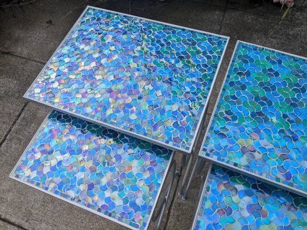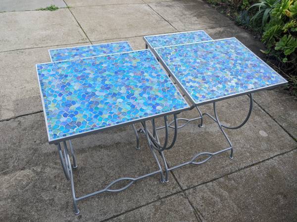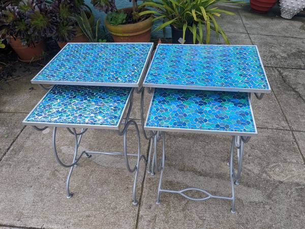 Hi. On sale here is a pair of beautiful and colorful Pier 1 mosaic glass top & metal indoor/ outdoor nesting side tables. In like new condition. Have 2 sets available. Each set contains 1 big and 1 small table. Looks gorgeous and beautiful!! A statement piece that can completely furnish any space into a lively and happy space. Ideal as side or end tables and use inside and outside. Perfect for living room, study room, recreation room, patio, balcony and backyard. Dimensions of the L table: 16" x 20 1/8" x 25"H. Dimensions of the S table: 16" x 13 1/8" x 22 1/2"H. Selling now for $300 a set. Both set for $500. Cash only