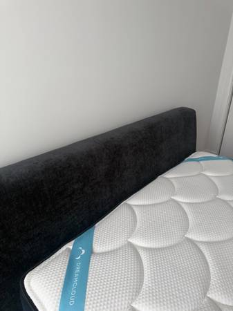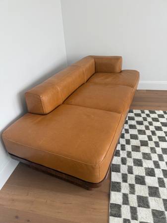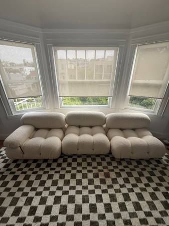 Mario Bellini Sofa Classic Boucle-Pearl ($5500) TV/Stand - Cost Plus World Market & Samsung 85'' ($600) CB2 Brown Leather Daybed ($2500) Green Checkered Rug - 9x12 ($200) Bed/ Black Suede Frame...