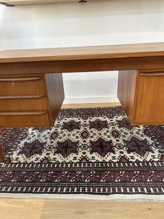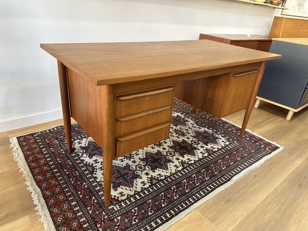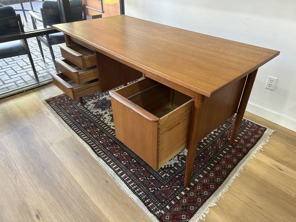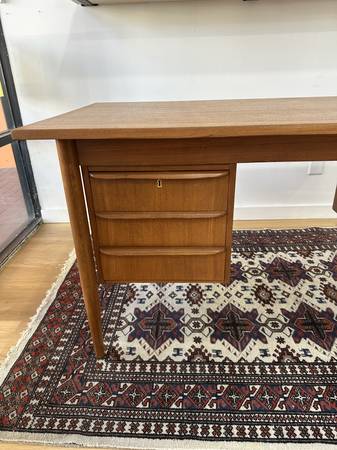 Mid Century Danish Teak Desk. No Key. Made in Denmark. Measurements: 60.25”W x 29.25”D x 29.75”H