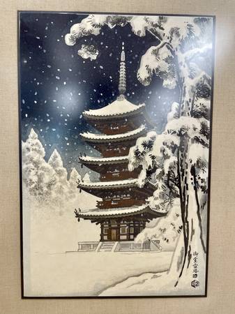 Mid Century Modern Temple in Snow Woodblock with Bamboo Frame Measurements: 17”W x 24”L