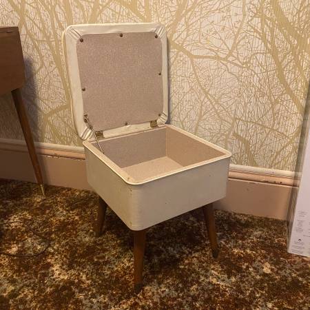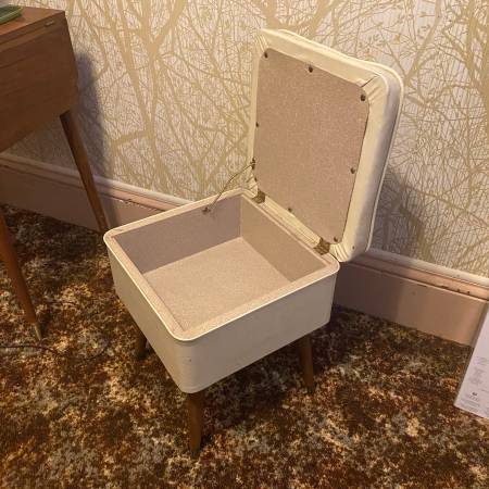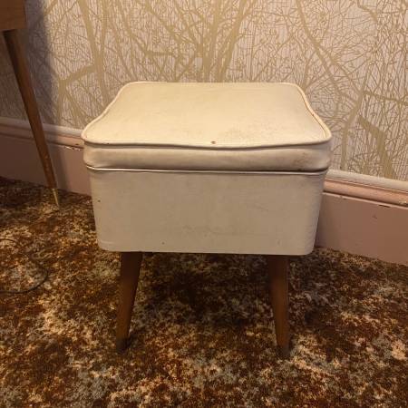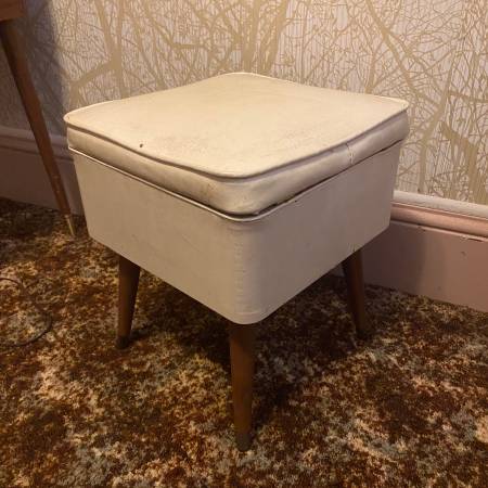 Vintage storage stool chair for $20. Mid-century modern design. Overall condition shown in the photos. One leg is a little wobbly, but an easy fix for someone handy. Dimensions are 16” W x 16” D x 18.5” H.