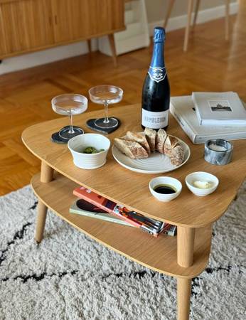 Mid-century style oak veneer coffee table. Comes with floating shelf underneath. Great quality, Danish style design. Already disassembled. A few minor scuffs (pictured).