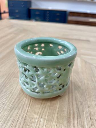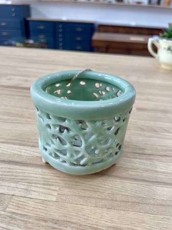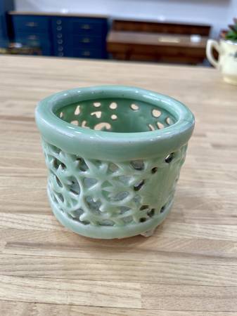 Asian miniature open worked celadon censer on raised feet. Dimensions: 3”W x 2.5”H