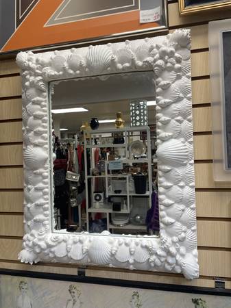 Mirror, White Shell Decoupage Frame, Handmade, Vintage Dimensions: 25”L x 20”W