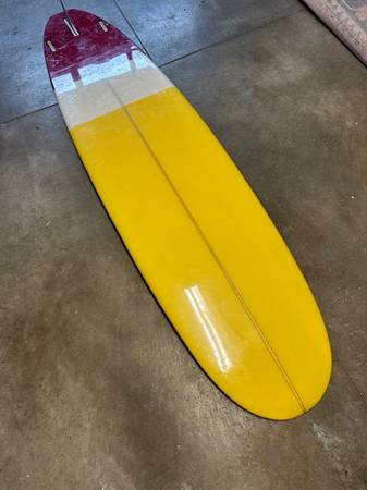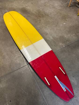 All around modern Roland longboard. Length: 8'6" Width: 22" Thickness: 2 7/8” Stable and maneuverable surfboard. Fin setup is a center fin box with side boxes. Airbrush, Gloss and Polish. Clean, no...