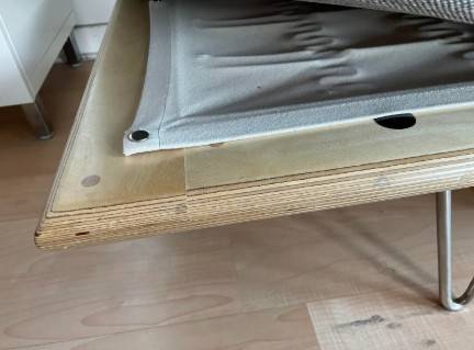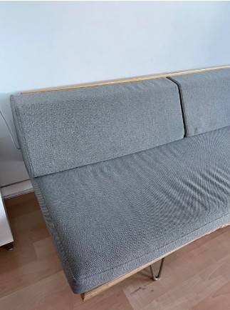 10 year old Case Study V-Leg Daybed. Constructed of birch plywood and a powder-coated metal spring, covered with a removable canvas cover. The V-legs and back rest supports are brushed chrome-plated steel. The mattress and two bolsters are made with high-density foam. When you remove the bolsters, the daybed converts into a guest bed. You can create a sectional by combining other pieces from the collection (see my other post for a corner piece). The fabric covers were replaced 5 years ago, so the fabric is in good condition. New covers and foam can be purchased from the original manufacturer, Modernica.