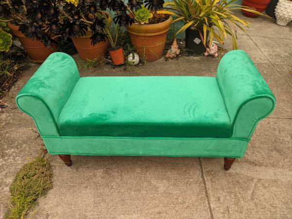 Hi. I'm selling my Beautiful Ultra plush Dantzler Upholstered Bench by House of Hampton. In like new condition. Gently used for 3 months. No damage and stain anywhere. With its bright emerald hue, this bench instantly adds a pop of color to your ensemble. Leaning more traditional, its hardwood frame is founded atop four turned feet finished in stately brown. Up top, rolled arms and piping trim define the microfiber-upholstered seat, hued in that vibrant, verdant tone. Measuring 23.23'' H x 45.08'' W x 16.93'' D, it's the perfect size for accenting your entryway or sitting at the base of your bed. Paid over $320. Selling now for $240. Cash only