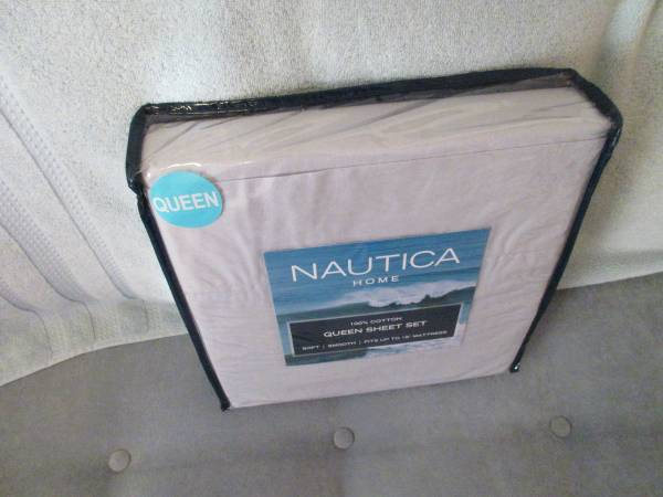 Nautica Home 100% cotton 4-piece Queen Sheet Set. Brand new in package. Color is light silvery grey. Fits up to 18" mattress.