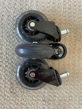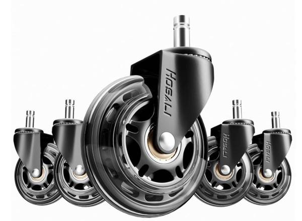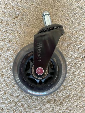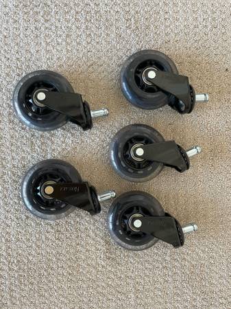 Brand-new HOSALI 3" rubber office chair casters (set of 5). Safe on hardwood/tile/carpet — no floor mat needed Smooth + quiet (roller-skate style bearings) Heavy-duty steel + PU, supports up to 650...