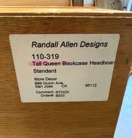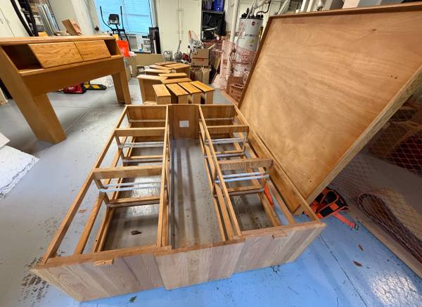 Platform with under bed storage (12 drawers/6 each side), book case headboard, matching night stands (w/ 3 drawers each). Modular construction for transport. Solid construction (oak and plywood). Minor signs of wear and use.