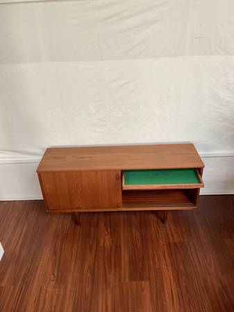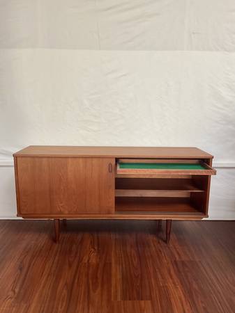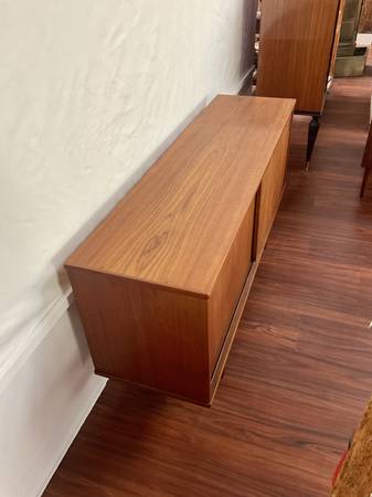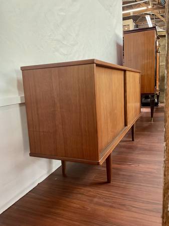 Refinished Vintage Mid Century Danish Teak Credenza By Dyrlund. 2 Sliding Doors. Made in Denmark. Dimensions: 59.75”W x 16.75”D x 29.5”H