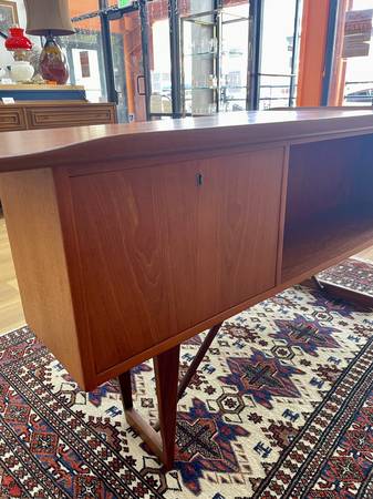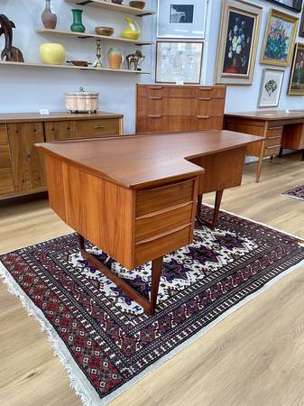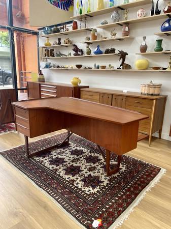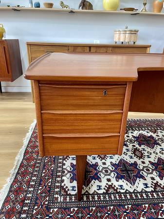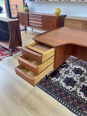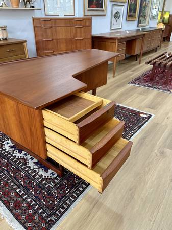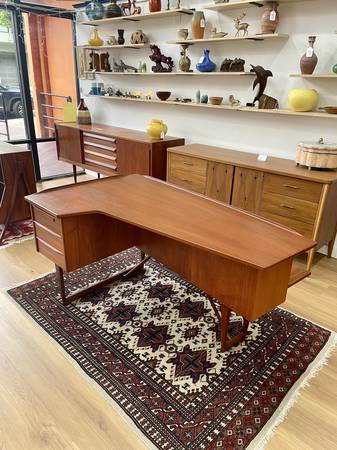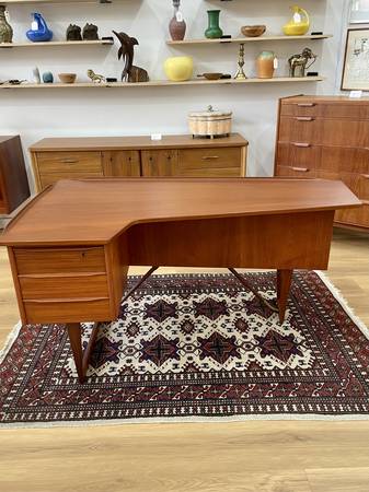 Refinished Vintage Mid Century Peter Lovig Nielsen Danish Teak Boomerang Desk With Key Measurements: 58.75”W x 34.75”D x 28.5”H