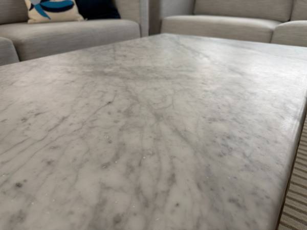 Light surface scratches from normal use, but nothing major or really noticable. If you need a brand new surface, any stone worker can easily hone the marble surface for cheap as it's a small slab. But you likely won't find a need for this as there's no stains/ etching and it's very uniform. See the surface photos. Priced with a $3,400 discount off new as it's a used piece.
